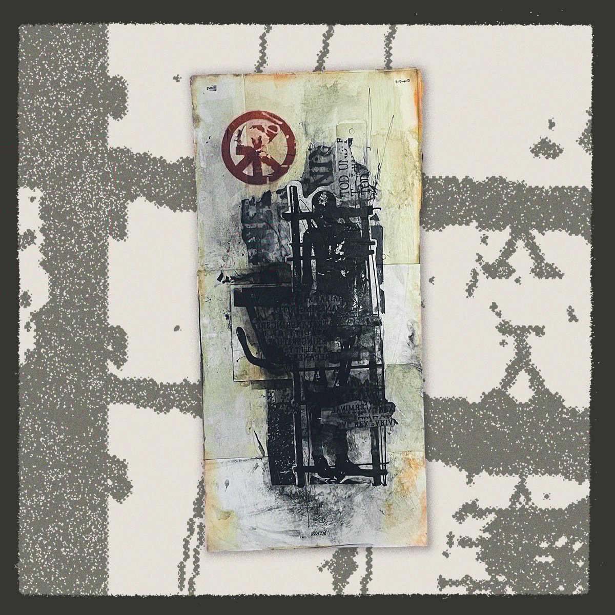 Collage, Xerography, rubber stamps, spray paint, pen, pencil, and ink on antique paper, mounted on masonite.